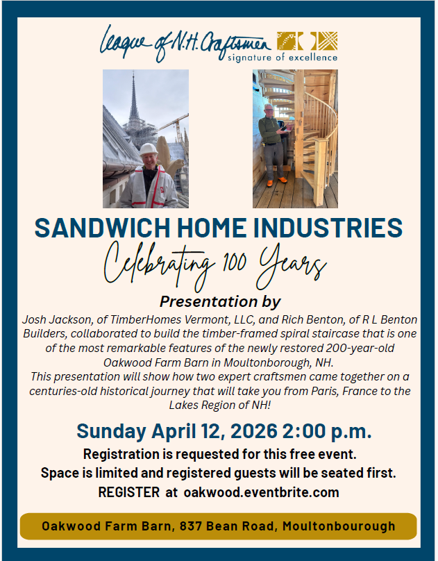 Then in 2025 Rich Benton, a longtime Sandwich resident and building contractor specializing in timber framing, and Josh collaborated to construct and install the timber-framed spiral staircase that is one of the most remarkable features of the newly restored 200-year-old Oakwood Farm Barn in Moultonborough, NH.
